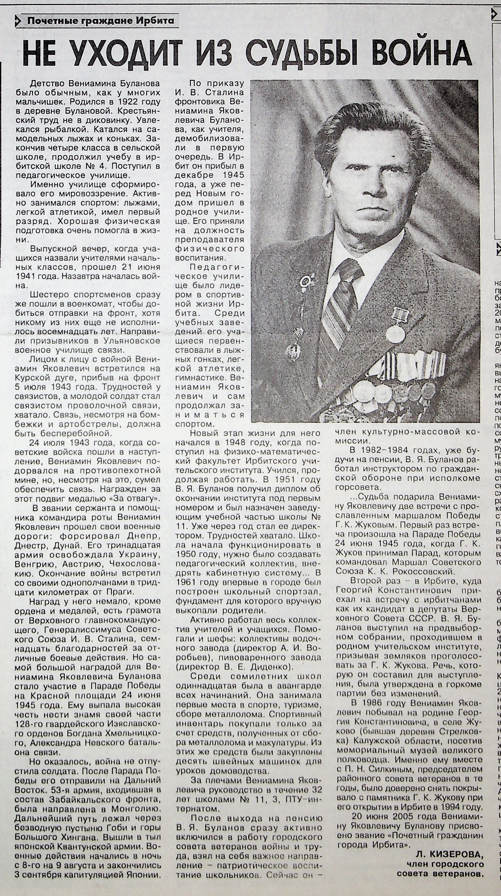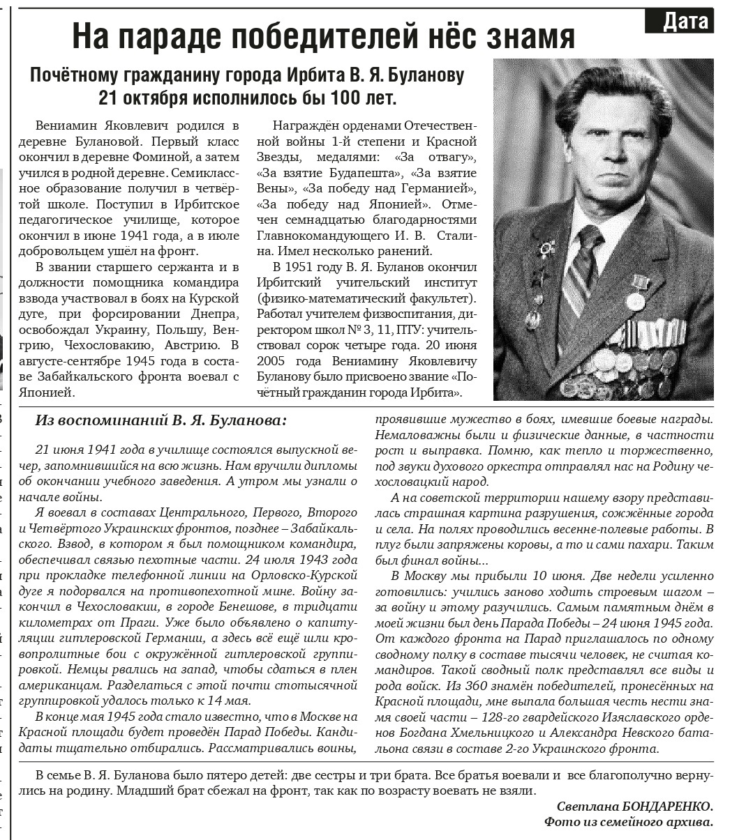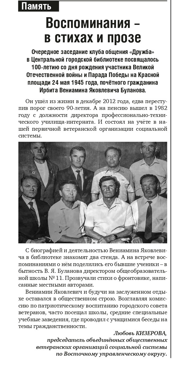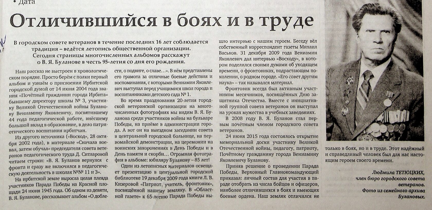 При составлении виртуальной выставки использованы фотоматериалы из сборника «Учитель, фронтовик, Почётный гражданин… : посвящается Вениамину Яковлевичу Буланову» / сост. Л. Кизерова. – Ирбит, 2008. – С. 25-26. – (Ирбитская библиотека).