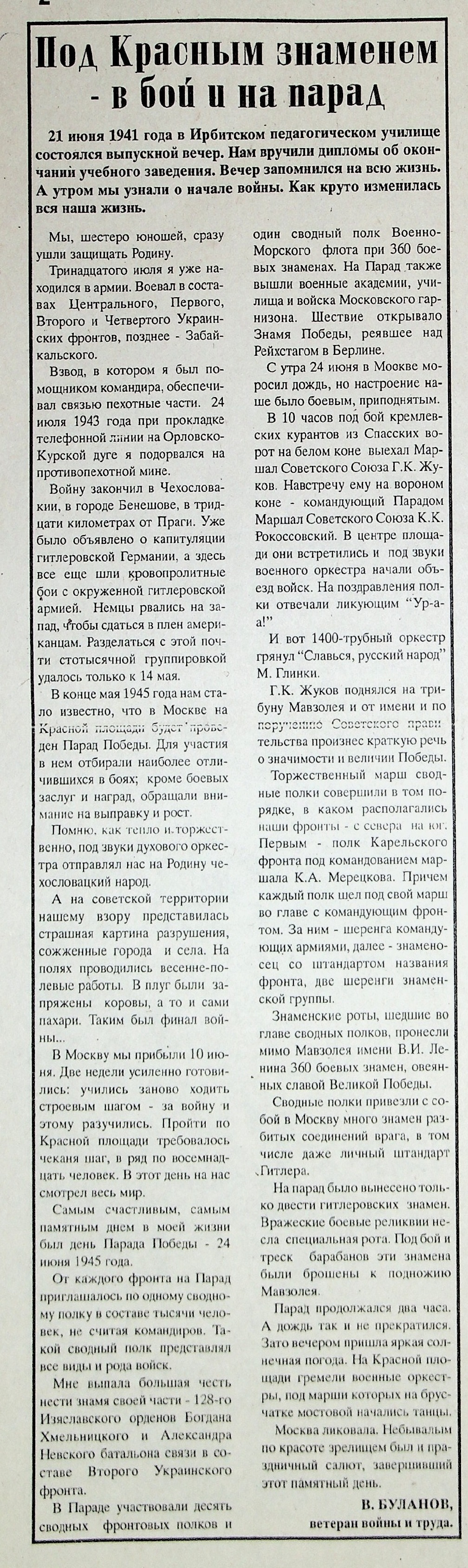 "...В конце мая 1945 года нам стало известно, что в Москве на Красной площади будет проведён Парад Победы. Для участия в нём отбирали наиболее отличившихся в боях. Кроме наличия боевых заслуг и наград, обращали внимание на выправку и рост.