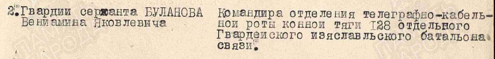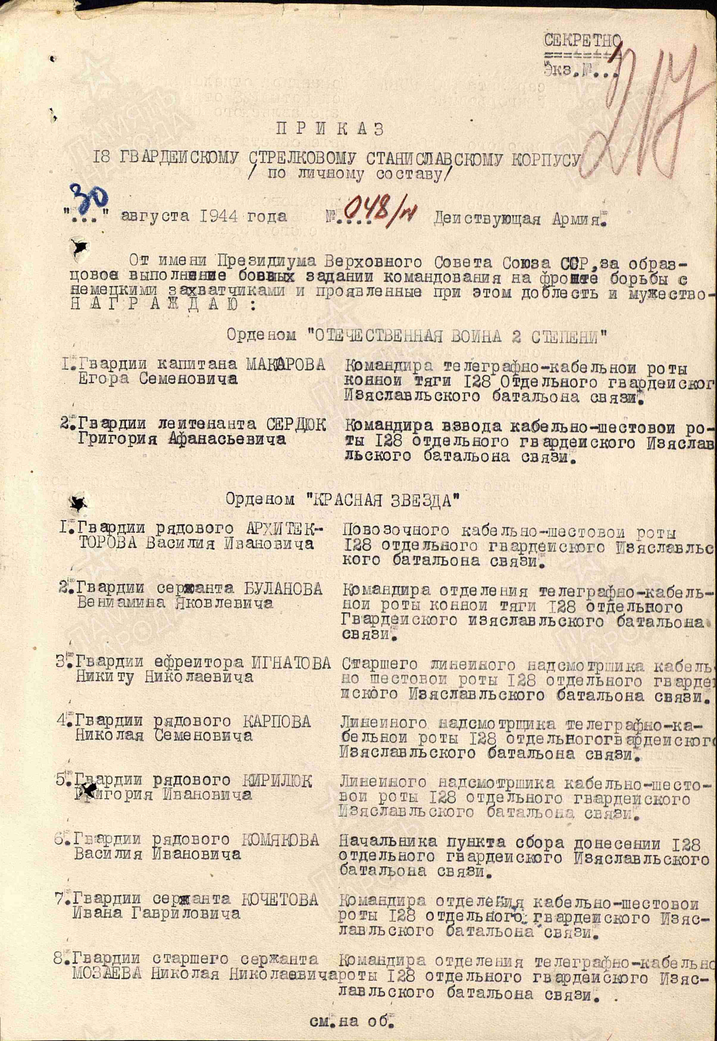 Приказ о награждении В. Я. Буланова орденом Красной Звезды от 30 августа 1944 года.