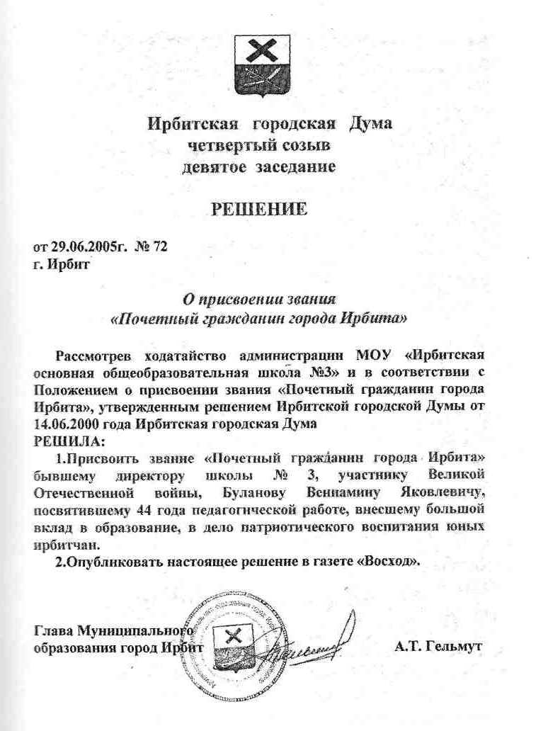 За большой вклад в образование, в дело патриотического воспитания юных ирбитчан решением Ирбитской городской Думы № 72 от 29 июня 2005 года Вениамину Яковлевичу Буланову присвоено звание «Почетный гражданин города Ирбита».
