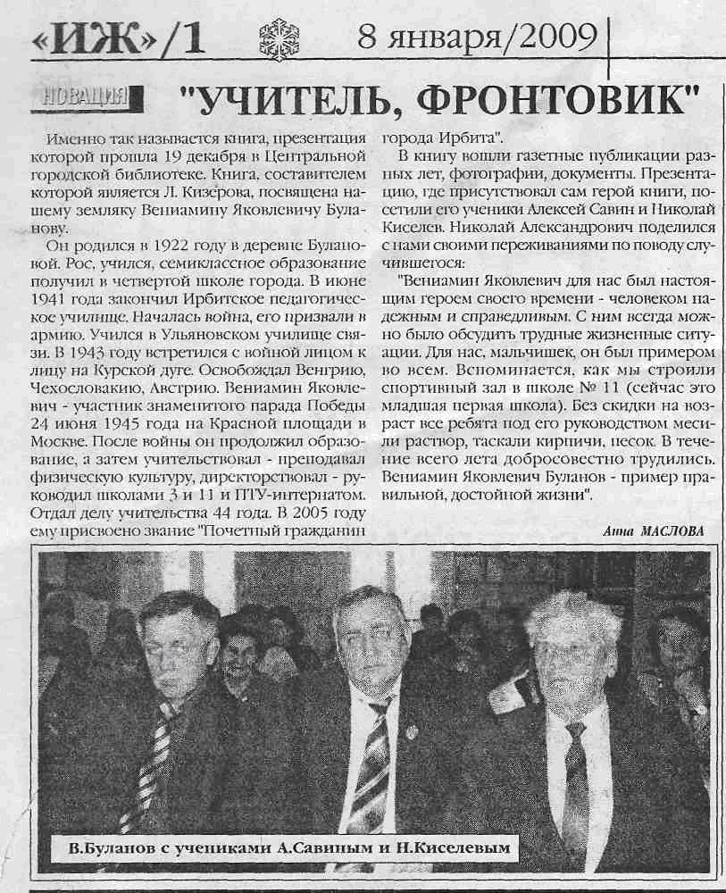 «Учитель, фронтовик, Почётный гражданин…» – именно так называется книга, презентация которой состоялась 19 декабря 2009 года в Центральной городской библиотеке. Сборник, составителем которого является Любовь Васильевна Кизерова, посвящен нашему земляку Вениамину Яковлевичу Буланову.
