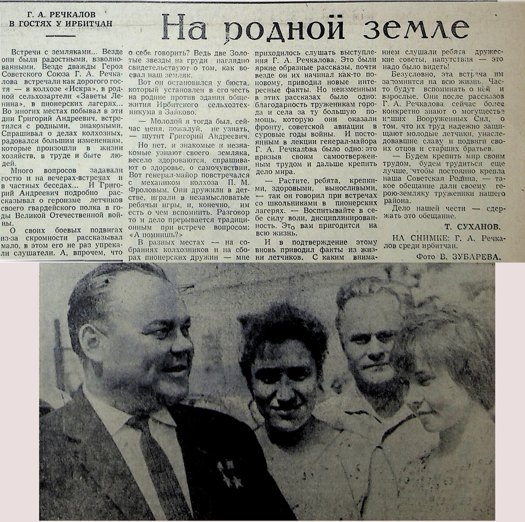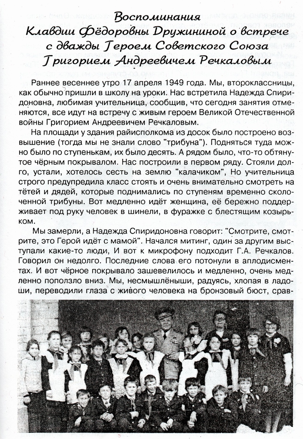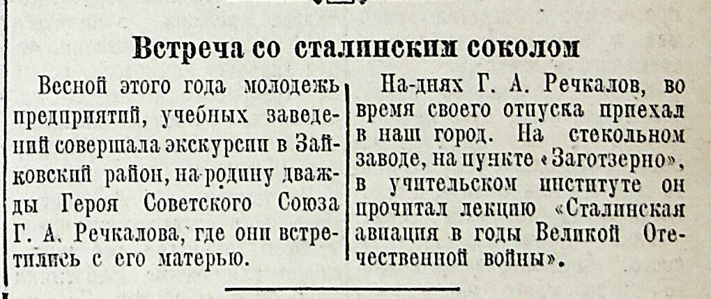 В 1984 году Г.А. Речкалов посетил малую родину в последний раз. «Пора начинать соревнования…», - писала газета «Восход» 10 октября 1984 года, - «Из дверей Дома культуры выходит дважды Герой Советского Союза Григорий Андреевич Речкалов…». Все 290 участников пробега встретили Григория Андреевича дружными аплодисментами. Он обращается к участникам мероприятия со словами приветствия. Объявлена десятиминутная готовность. Однако спортсмены не торопятся начать разминку. Все хотят сфотографироваться с прославленным асом, взять у него автограф на память.»