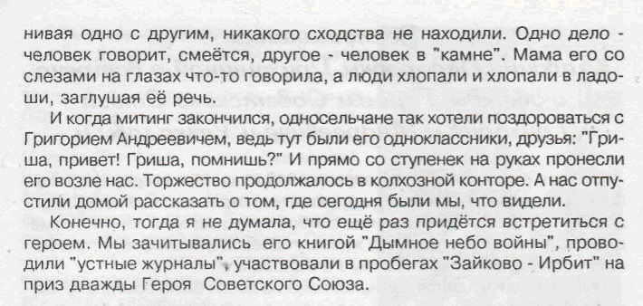 Григорий Андреевич не забывал своей малой родины, занимался военно-патриотическим воспитанием молодёжи, встречался с земляками. На встречах Григорий Андреевич подробно рассказывал о героизме лётчиков своего гвардейского полка, но о своих боевых подвигах из-за скромности рассказывал мало, в этом его не раз упрекали слушатели. А в прочем, что о себе говорить? Ведь две Золотые звезды на груди наглядно свидетельствуют о том, как воевал наш земляк.