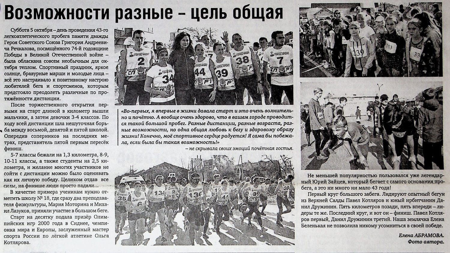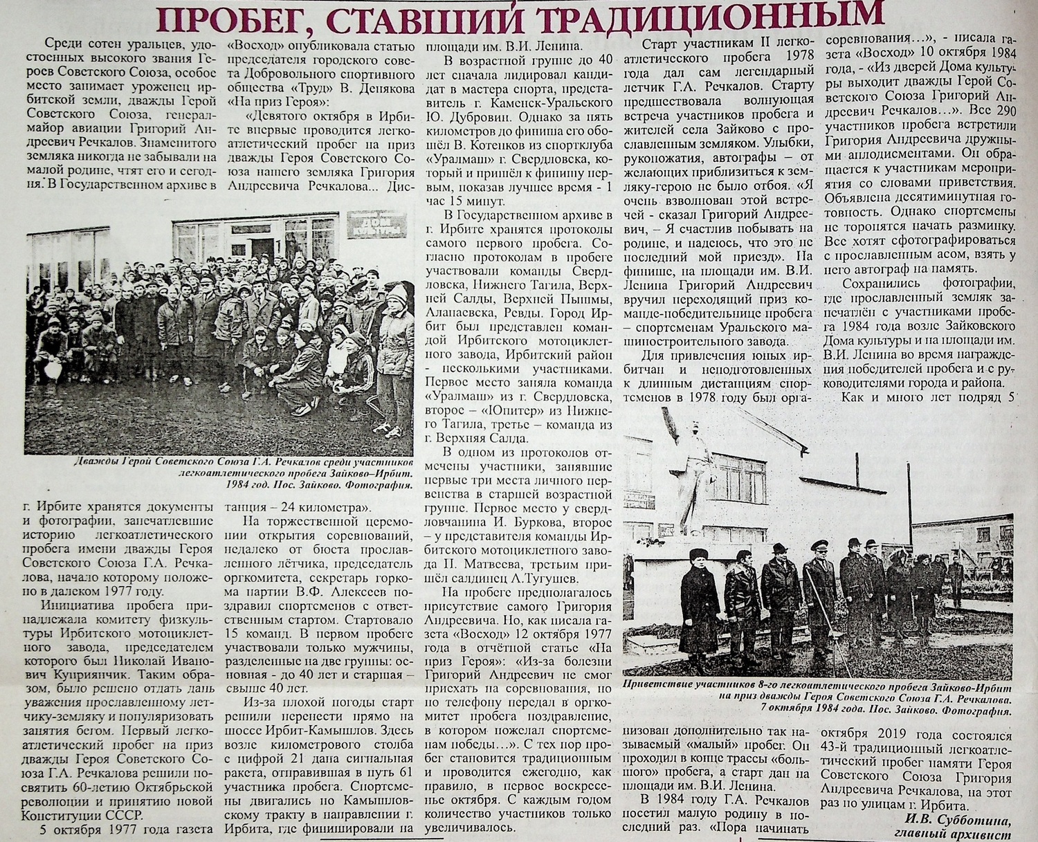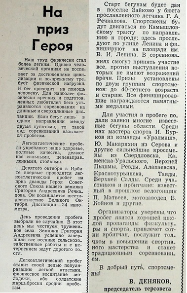 5 октября 1977 года газета «Восход» опубликовала статью председателя городского совета Добровольного спортивного общества «Труд» В. Денякова «На приз Героя»: «Девятого октября в Ирбите впервые проводится легкоатлетический пробег на приз дважды Героя Советского Союза нашего земляка Григория Андреевича Речкалова... Дистанция – 24 километра».
