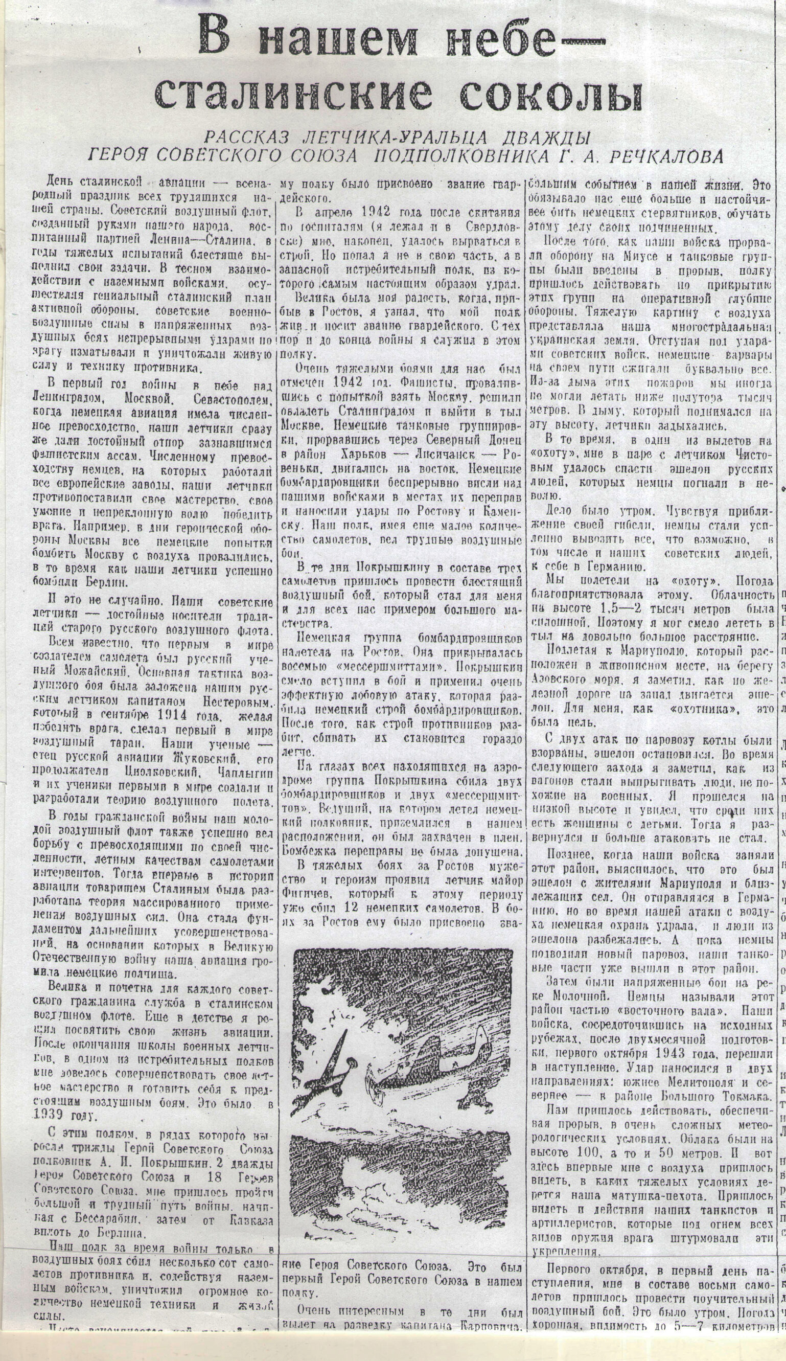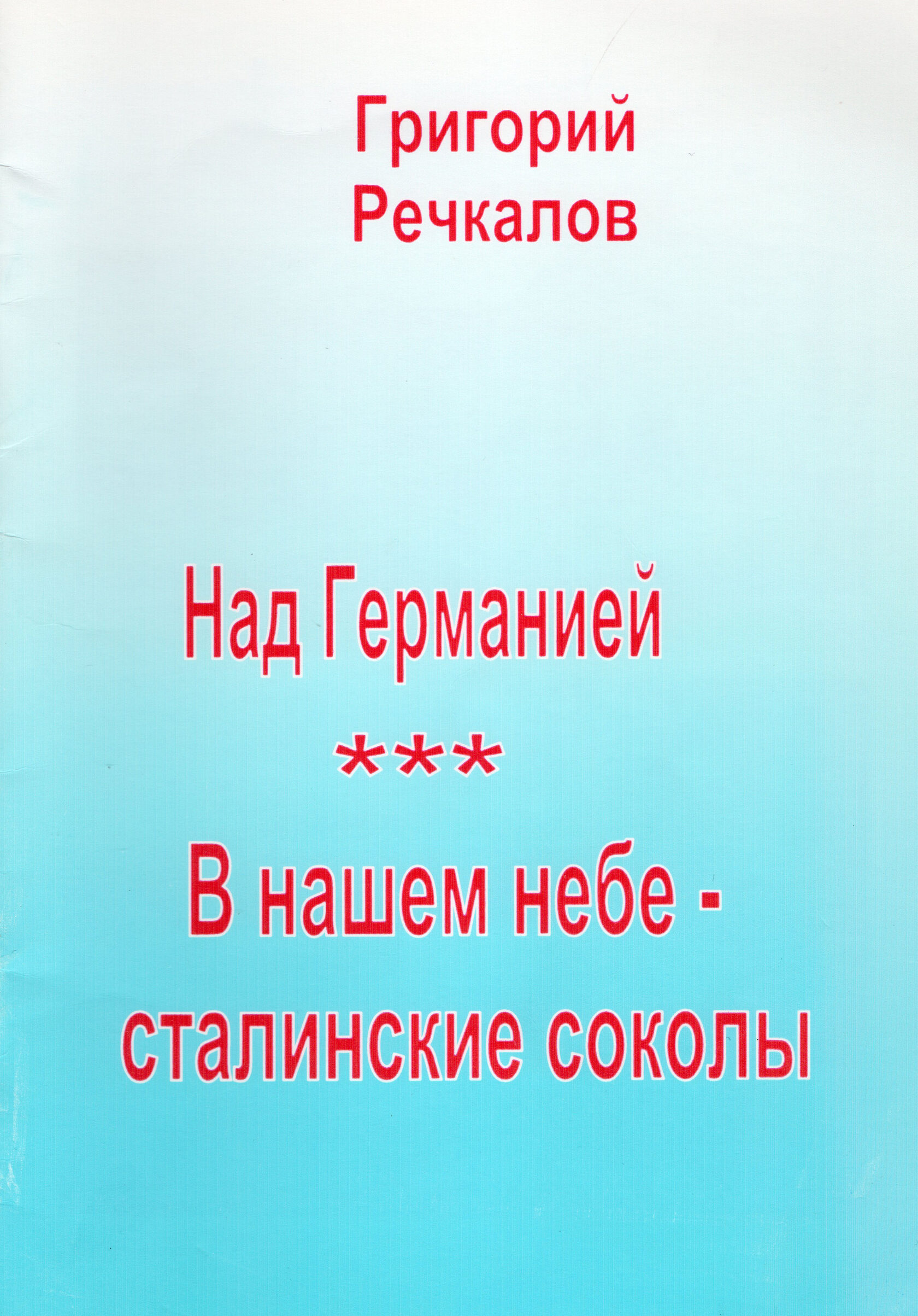 И. В. Сталин считал, что военные мемуары надо писать не раньше, чем через 30 лет после окончания Великой Отечественной войны. Маршалы и генералы опасались пойти против воли Верховного главнокомандующего, но смелый летчик-уралец, подполковник Г. А. Речкалов, дипломатично похвалив товарища Сталина за его «теорию массированного применения воздушных сил», за отеческую заботу о военной авиации, опубликовал-таки свои военные воспоминания в 1949 году, опередив на 20 лет четырежды Героя Советского Союза маршала Г. К. Жукова. Он особо подчеркнул численное превосходство германской авиации в первый год войны, что было результатом внезапного нападения фашистской Германии на СССР, истинные причины которого чрезвычайно интересовали Григория Андреевича, принявшего первый бой в первый день войны и встретившего День Победы в Берлине.