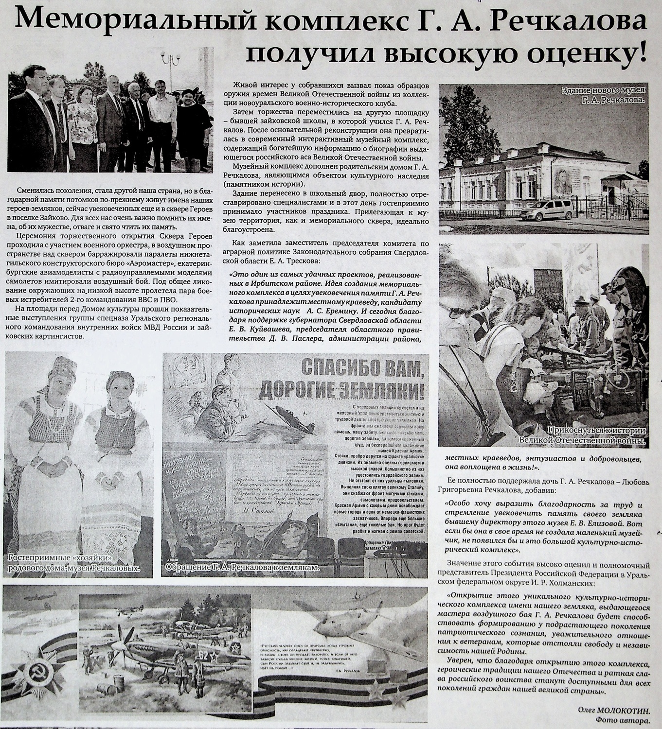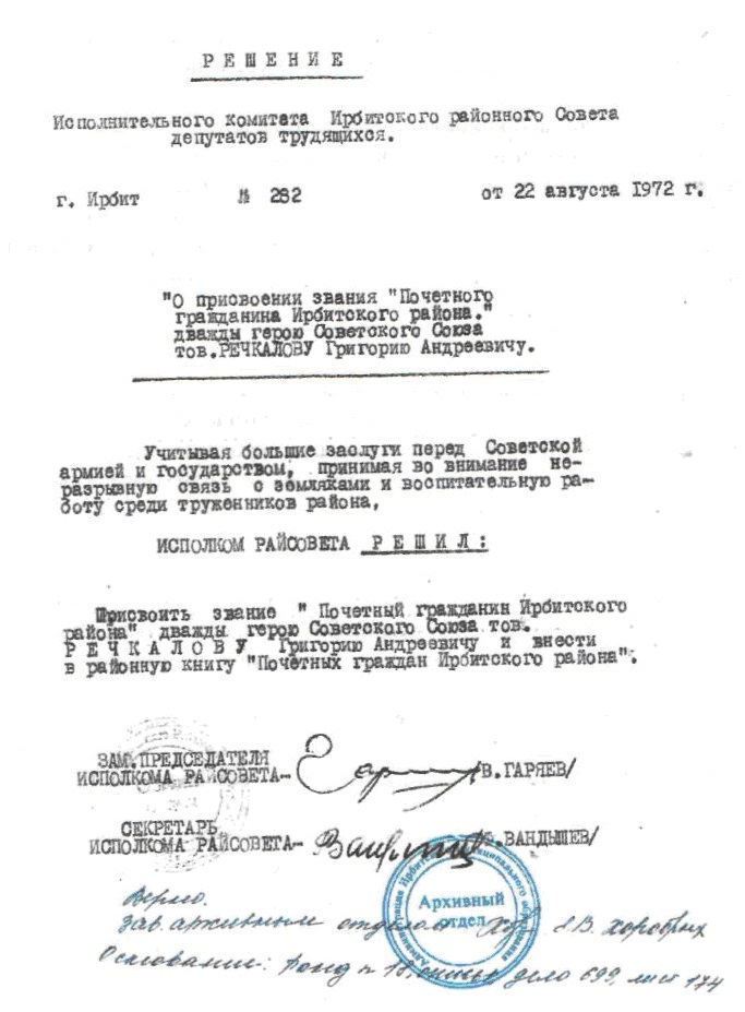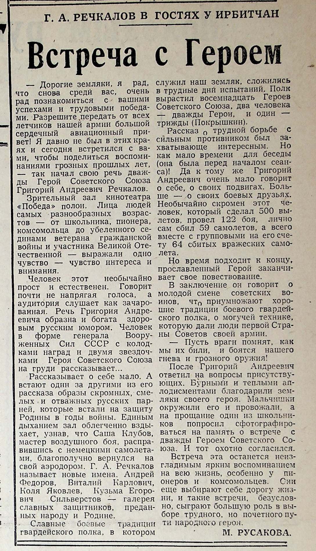 Всю жизнь посвятил Григорий Андреевич Речкалов беззаветному служению Отечеству, пройдя Великую Отечественную войну с первого и до последнего дня. Наперекор всему он пробился к дымному небу войны. Человек, которого признали негодным к летной работе в мирное время, стал одним из лучших советских асов. Трудовая закалка с раннего детства, умение терпеть нужду и лишения, а также особое, непостижимое отношение к родной земле, сформировали уральский характер, о котором писал в своей книге «Дымное небо войны» Григорий Андреевич Речкалов: «По природе своей суров уральский человек. Но суровость эта только внешняя. Стоит с ним соприкоснуться поближе- и сразу чувствуешь, каким богатством наделена его душа. Радостью не разбрасывается, в суровые будни не гнется, в нужде и беде черствым, ледяным не останется».