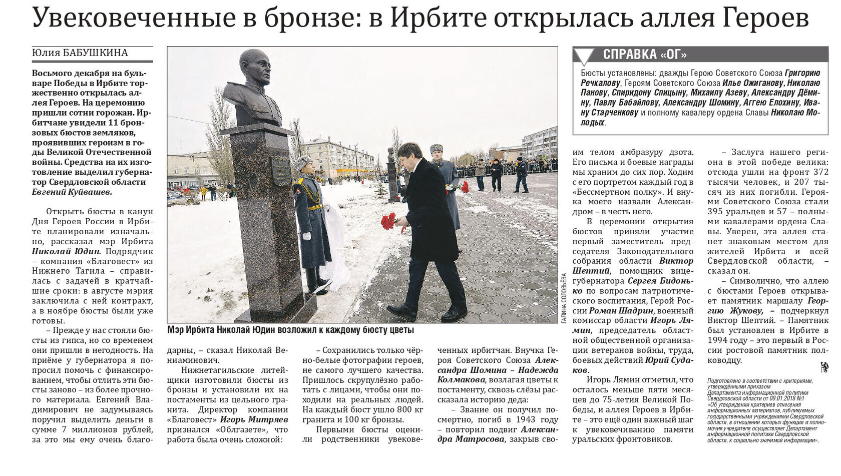 В сердцах ирбитчан бесконечно жива память о своем героическом земляке. Угаснуть этому святому чувству не дают люди, которым посчастливилось общаться с Григорием Андреевичем. Они стали инициаторами всевозможных патриотических мероприятий и спортивных соревнований, посвященных памяти легендарного летчика-аса Великой Отечественной войны.